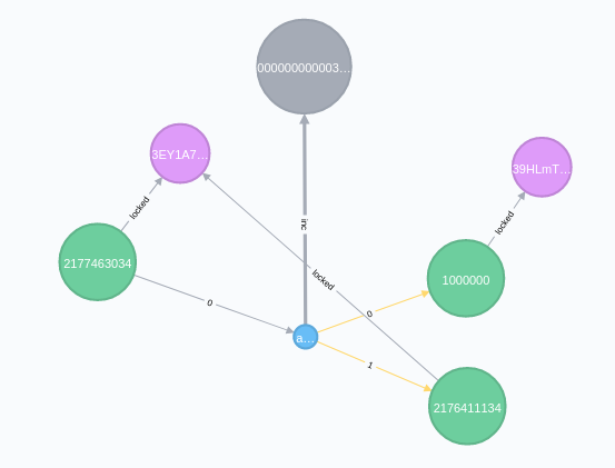 :outputnodes and relate them[:in]to the:tx.- SET the unlocking code as a property on the relationship.